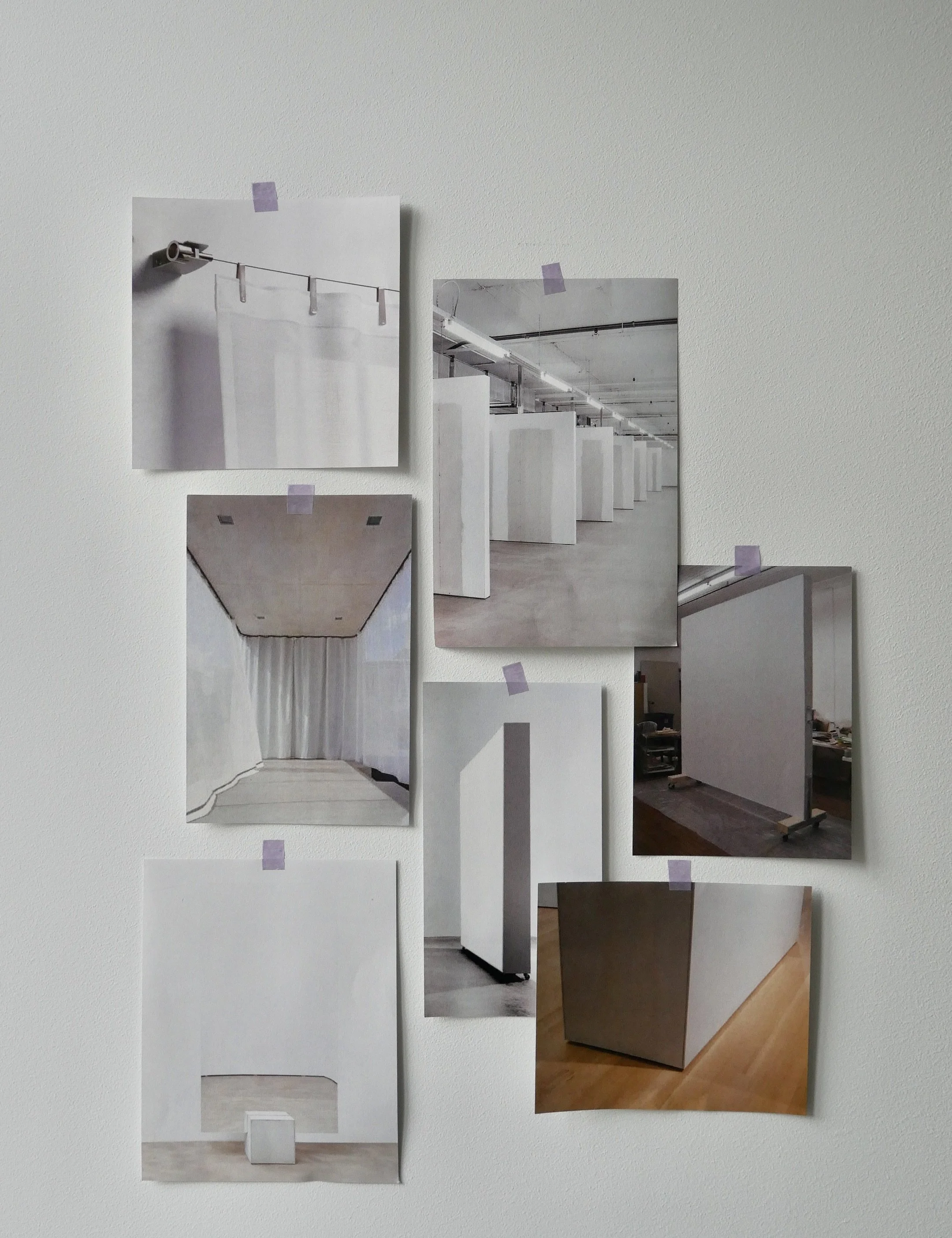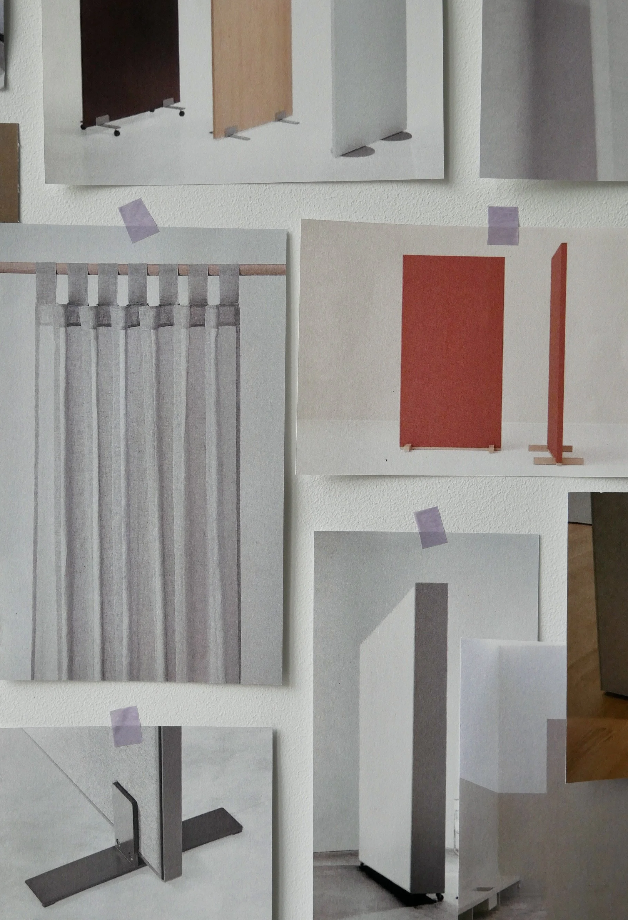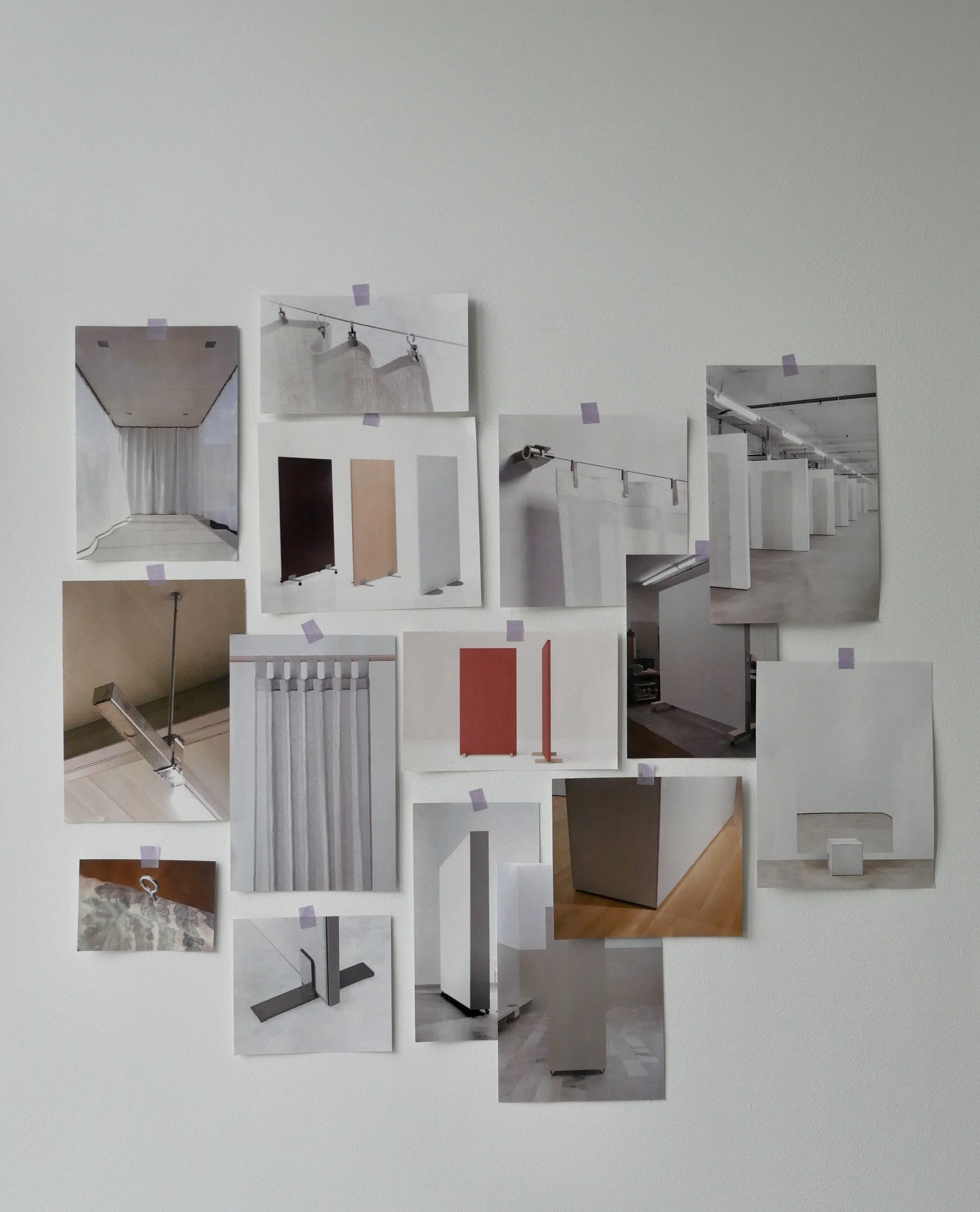 A backdrop of faded green-in-green, made from natural fiber fabrics by Kvadrat, aims to create a welcoming atmosphere. The mounting system is functional and straightforward; instead of curtain rails, industrial wires evoke an installation-like feeling, subtly contrasted by home furniture. This simple setup encourages visitors to engage with the displayed products without distraction.
