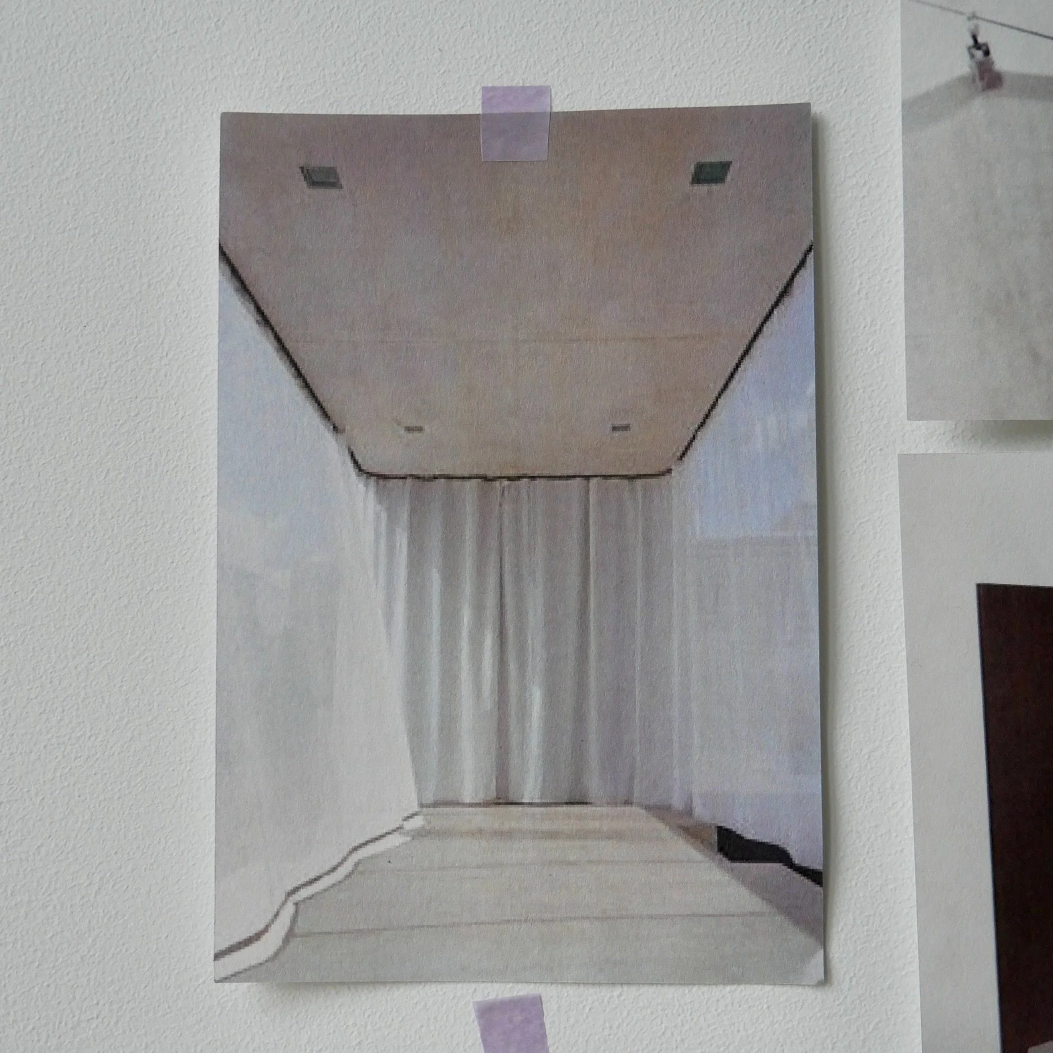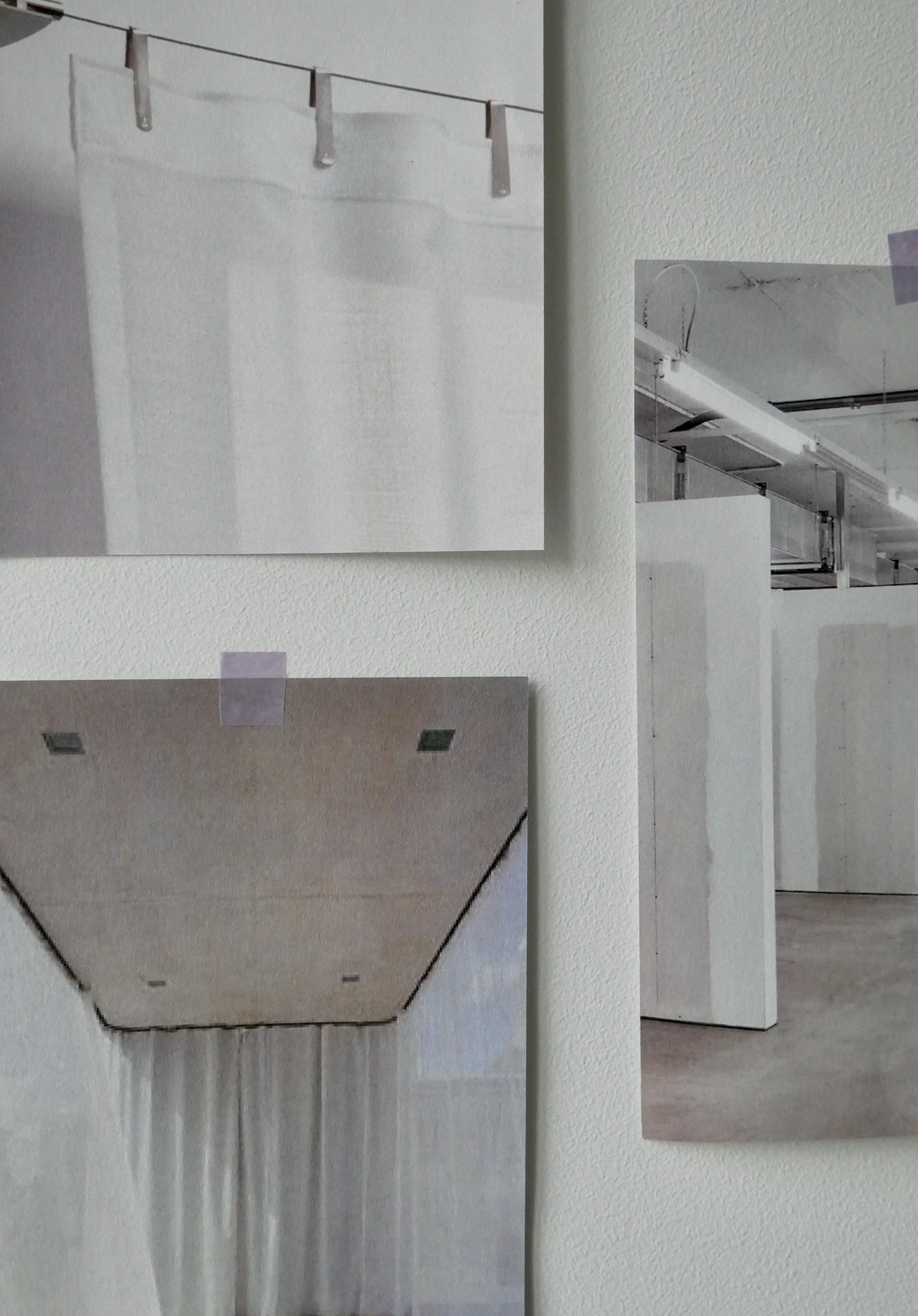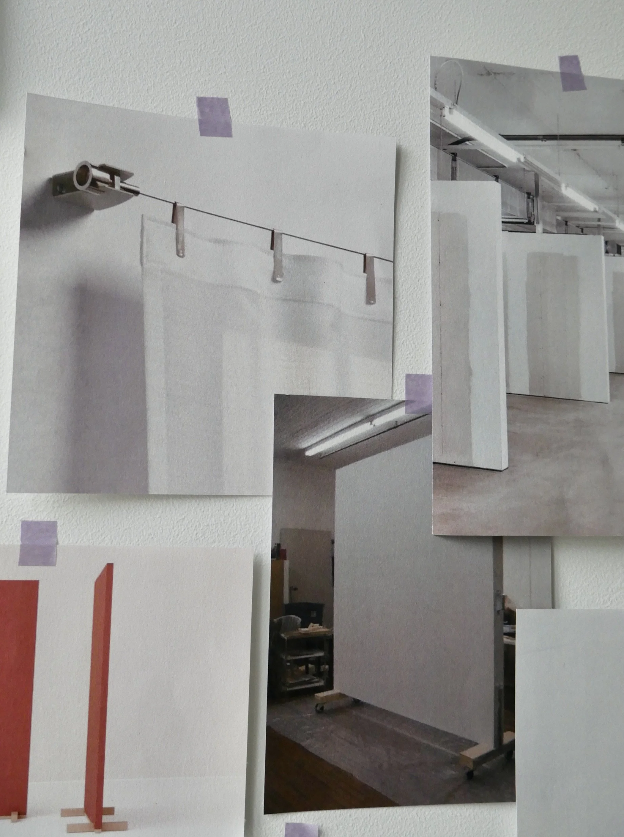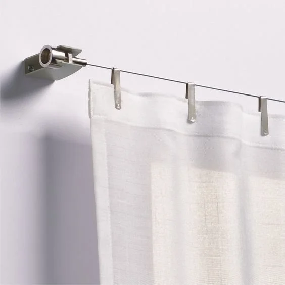 A backdrop of faded green-in-green, made from natural fiber fabrics by Kvadrat, aims to create a welcoming atmosphere. The mounting system is functional and straightforward; instead of curtain rails, industrial wires evoke an installation-like feeling, subtly contrasted by home furniture. This simple setup encourages visitors to engage with the displayed products without distraction.