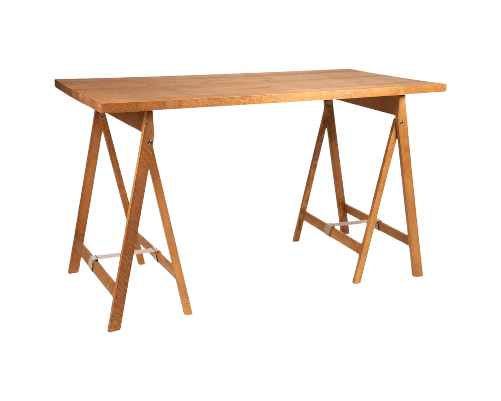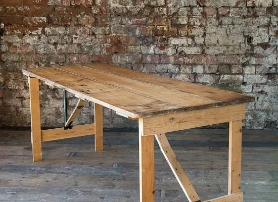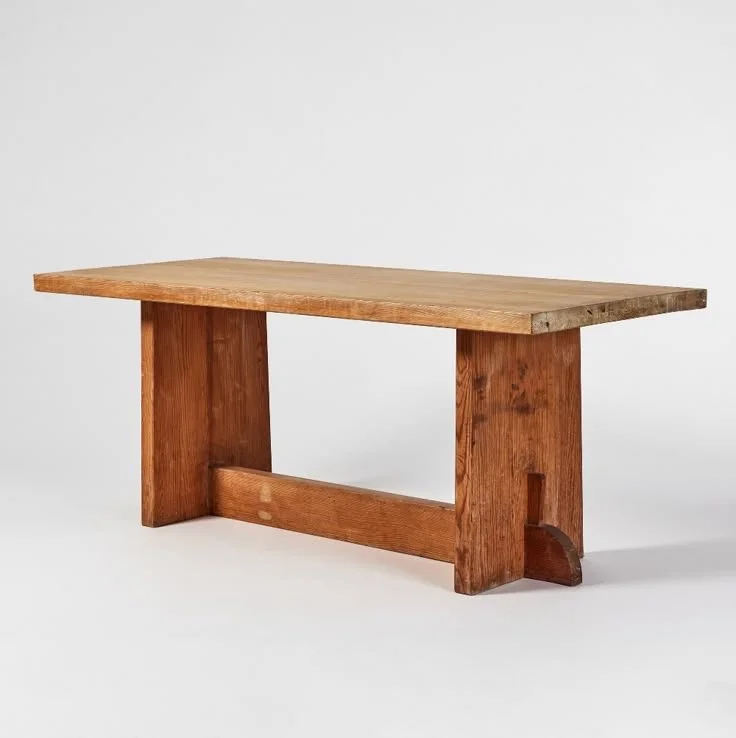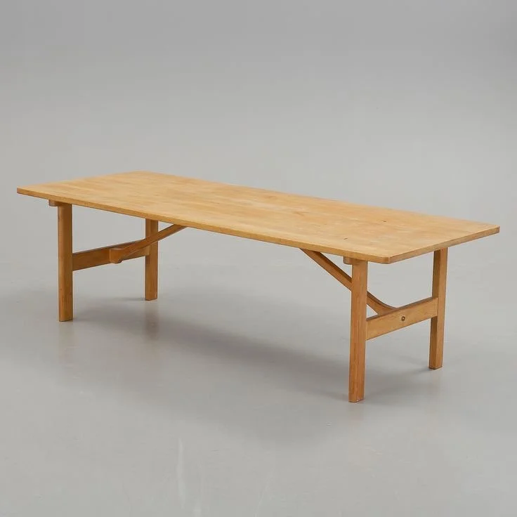 A minimalist wooden table with a crafty or trestle table feel, designed to the required size. The inspiration comes from something honest and simple, resembling a workshop table—either vintage or custom-made to specific measurements