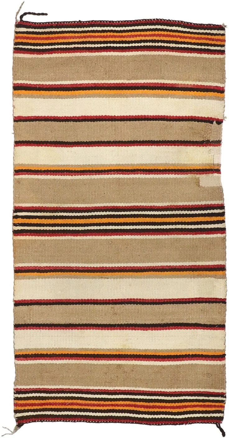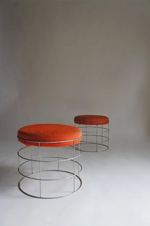 Mixed elements: an original vintage Navajo rug used for the upholstery of a few vintage stools with steel elements. The leftovers can also be used to create a few soft display 'pillows' for the table and windows, next to stone offcuts.